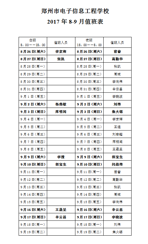 雷竞技最新2017年8-9月值班表