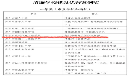 《中共郑州市教育局党组关于公布2022年“清廉学校建设优秀案例、优秀文化展评”评奖结果的通知》(郑教党〔2023〕94号)文件通知,我校《部门小微权力运行流程图》被市教育局党组评为清廉学校建设优秀案例奖一等奖。