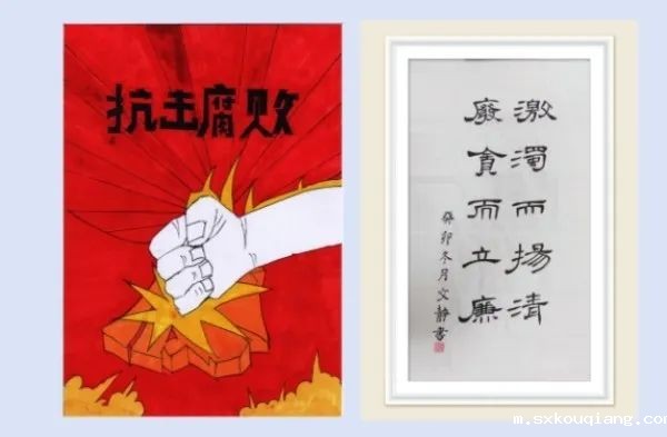 左:刘刚 手绘海报《抗击腐败》 右:肖文静 书法《激浊扬清,废贪立廉》